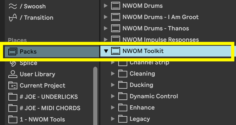The NWOM Toolkit installs directly into Ableton’s native Factory Pack Library. It shows up right in your browser - just like the packs you get from Ableton.